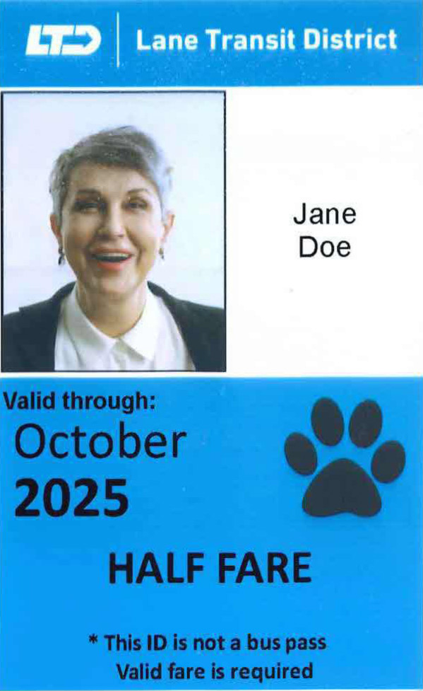 Visit a Customer Service Center and let them know you’re interested in the Paw Print Program. An LTD representative will ask what task your service animal is trained to perform and be available to answer any questions. Once approved, you’ll receive a rider card featuring a paw print symbol. Simply show this card to the bus operator when boarding, to demonstrate that you’ve already been asked about the status of your animal, and don’t need to be asked again.